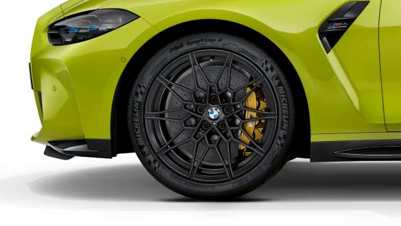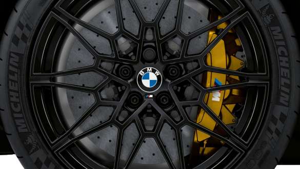 The M Carbon ceramic brake delivers braking power more directly. It contributes to a lower vehicle weight, which has a positive impact on agility, dynamics and acceleration. The technical equipment is visible through carbon-ceramic brake discs and calipers in the colour Gold matt with M lettering on the front and rear axle on the outside. Due to specific material properties, increased operating noise may occur during braking, e.g. in case of prolonged, low load or in wet conditions shortly before vehicle standstill. The design-related noise can be avoided by braking the brake dry in case of wetness or loading the brake more heavily after a long, low braking load. The influence of wetness and road salt cause brake effectiveness to correspond to that of a conventional brake system. This reduced braking power can be compensated for with a greater pressure on the pedal. The functional noises have no influence on the performance, operational safety and stability of the brake.