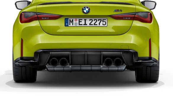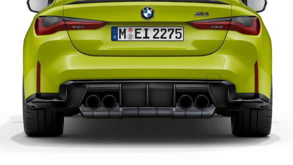 The rear of the BMW M4 Competition Coupé testifies to its power and athleticism. Two M typical twin tailpipes protrude from the rear section as sporty statement – framed by an optional carbon diffuser with distinctive vertical fins. Surrounding the diffuser and emerging from the sill area is a black high-gloss surface that luxuriously frames this sporty element. At the edge of the tailgate an optionally available M rear spoiler in carbon provides an athletic finish.