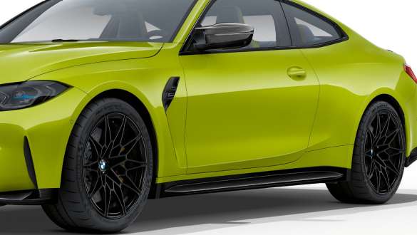 The side view of the BMW M4 Competition Coupé conveys concentrated power and dynamics. The black carbon roof and the aerodynamically optimised sill area inspired by motorsport press the silhouette of the vehicle even closer to the road both optically and physically. The optional M specific exterior mirrors in carbon and the M gills with model logo impressively round off the sporty appearance alongside the distinctive M forged wheels.