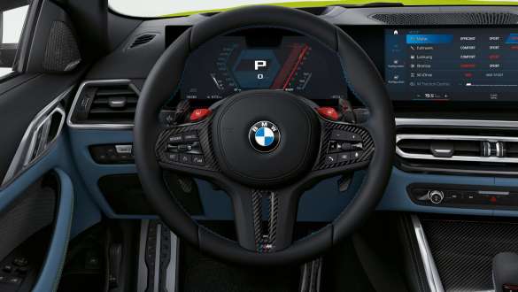 The M Carbon steering wheel provides a racing feel. The carbon-fibre trim strips in the spokes surround the operating elements and complement the high-quality feel of the steering wheel. The racing-tested material fits the dynamically designed interior visually, too.